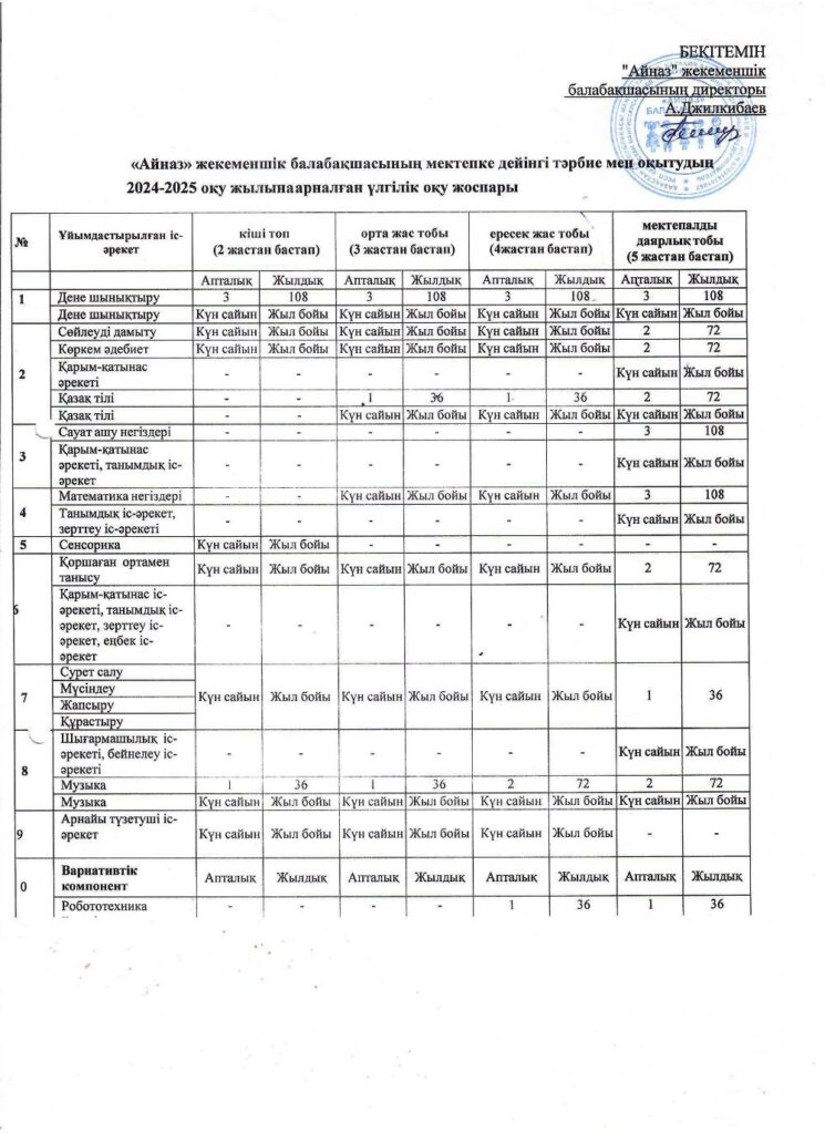 Айназ» жекеменшік балабақшасының мектепке дейнгі тәрбие мен оқытудың 2024-2025 оқу жылына арналған үлгілік оқу жоспары